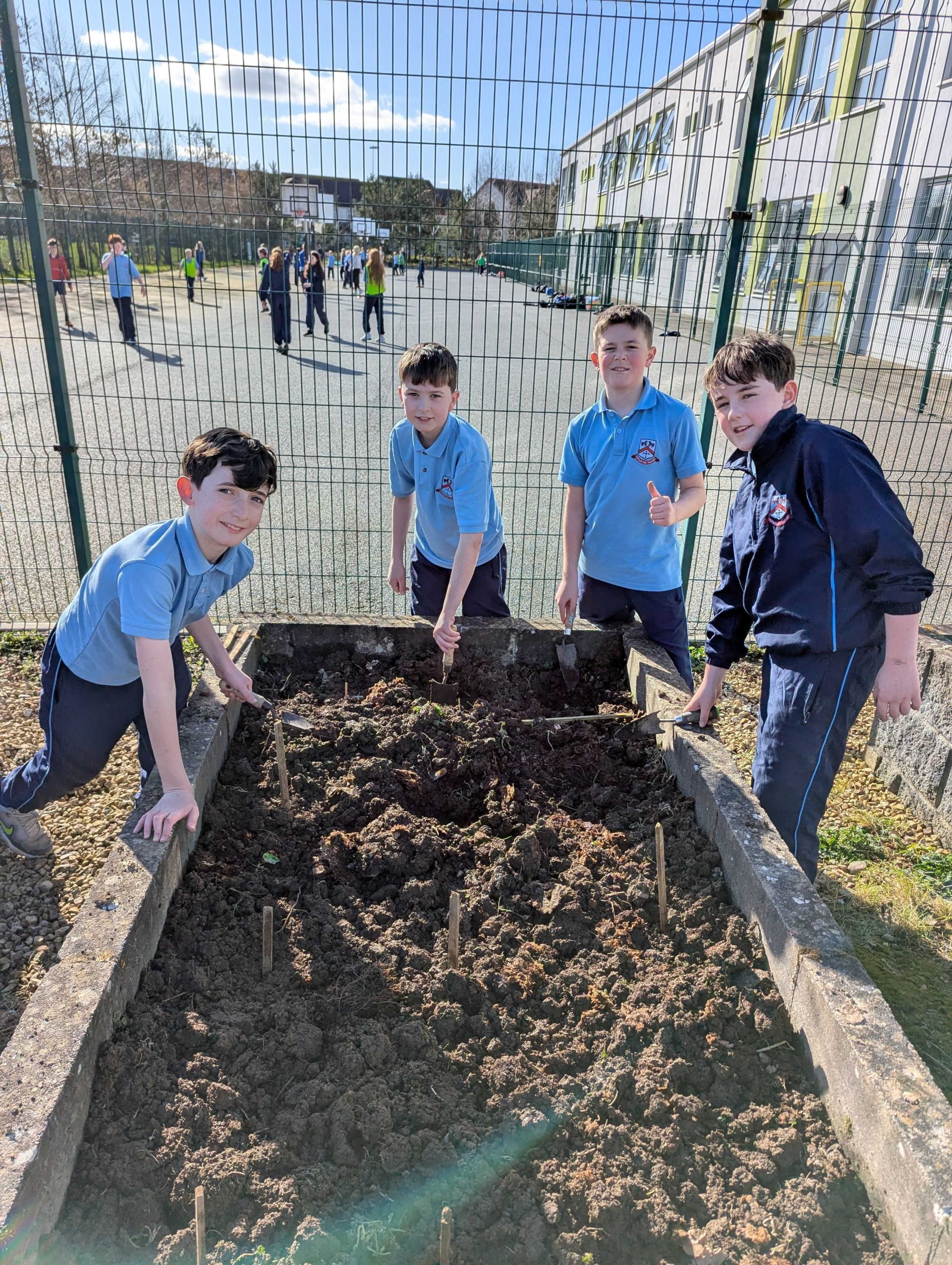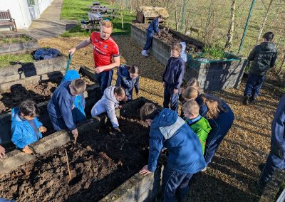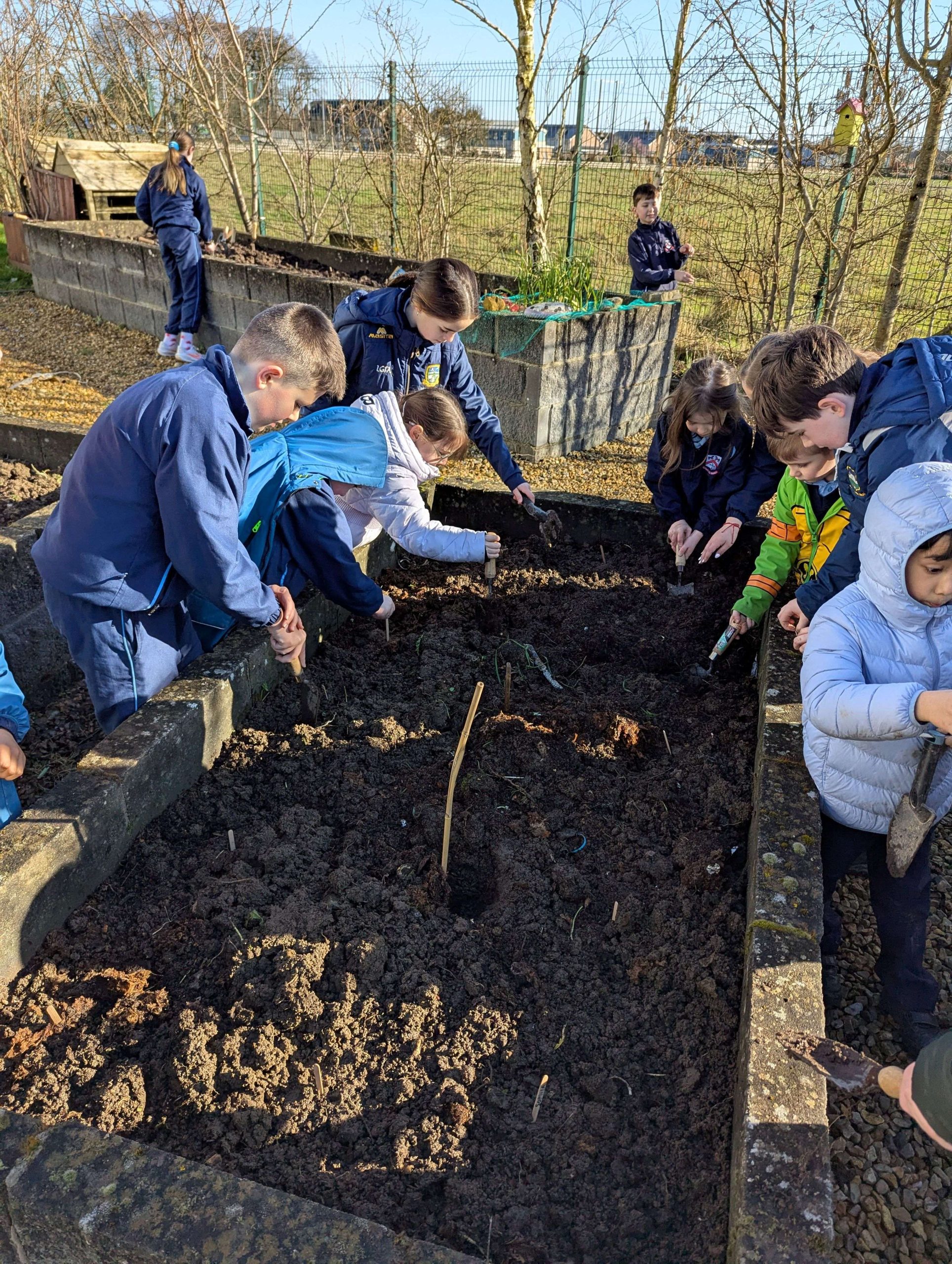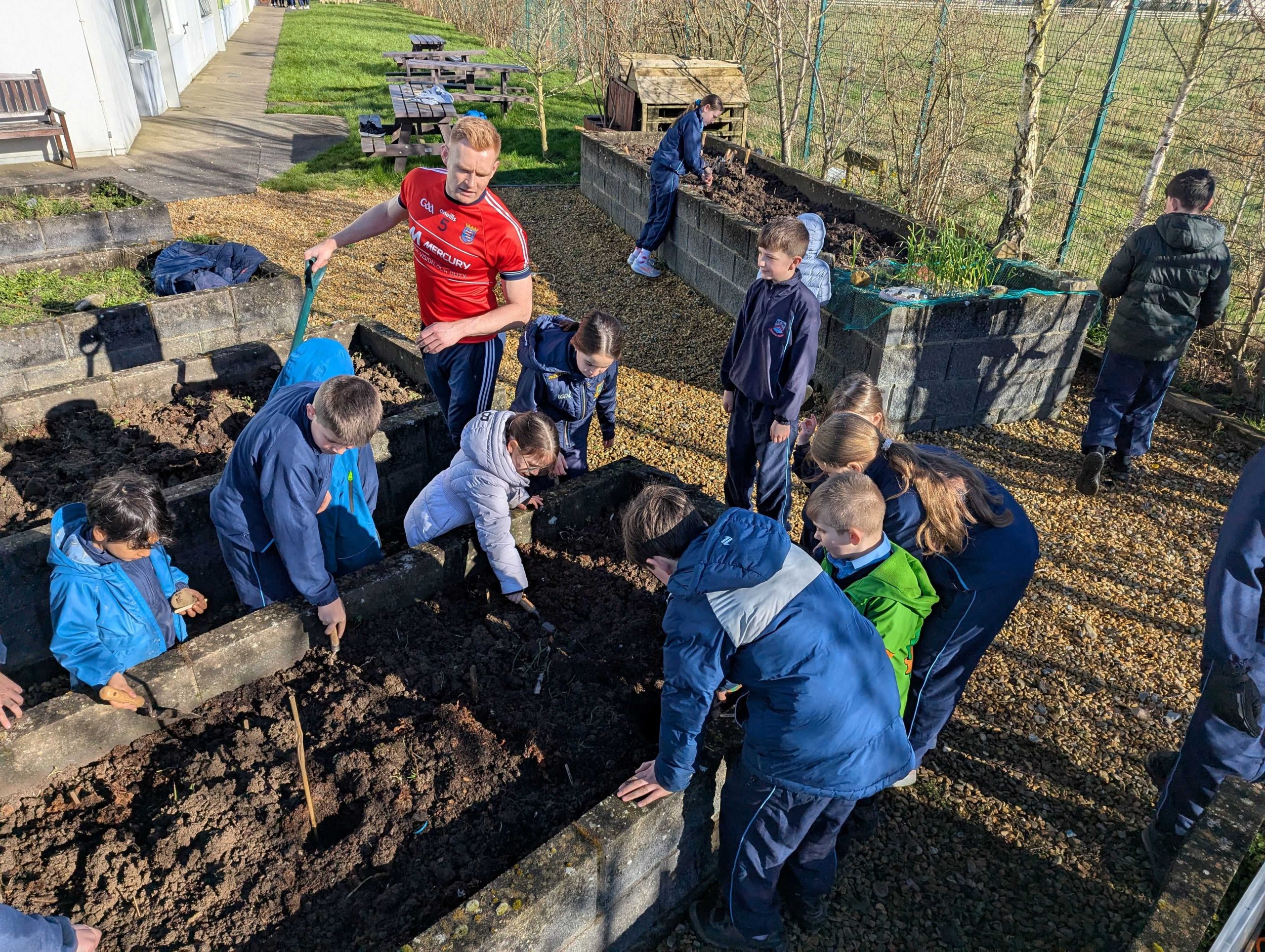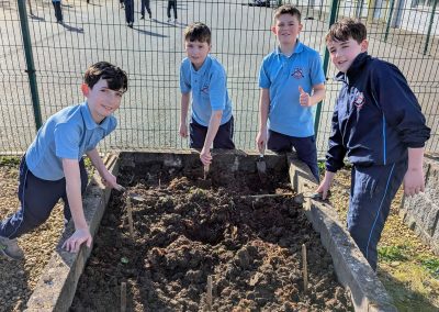 Well done to Ms. O’Donovan’s 5th Class and Mr. O’Donnell’s Junior Infants who planted potatoes outside in the garden this week.