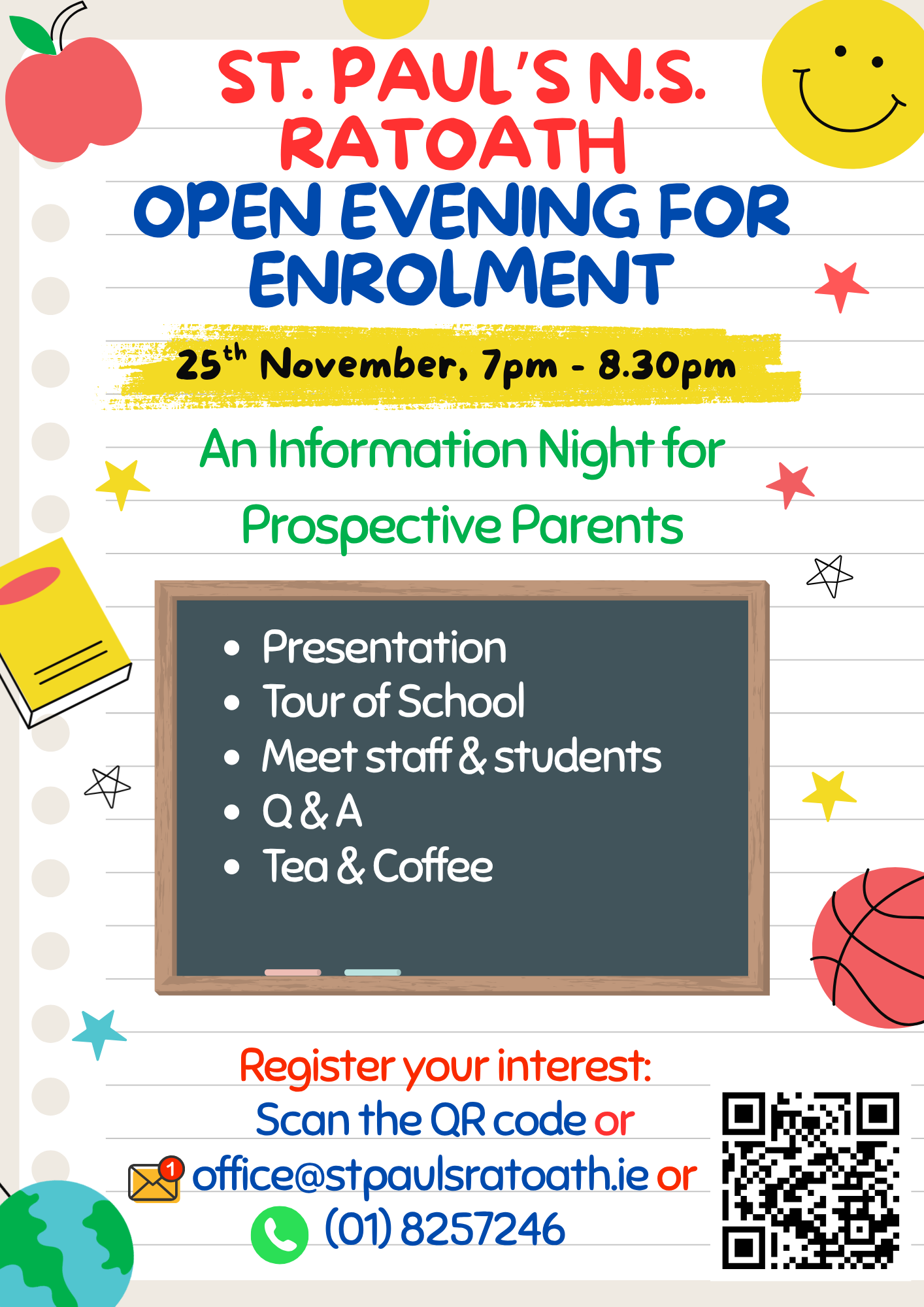 St. Paul’s are having an open evening for prospective parents on Tuesday the 25th from 7pm – 8.30pm. Please note the open evening is designed as an information night for parents and will not be suitable for children. Instead, there will be an opportunity for children who are offered and accepted a place in Junior Infants 2026/2027 to come into the school in May / June 2026.